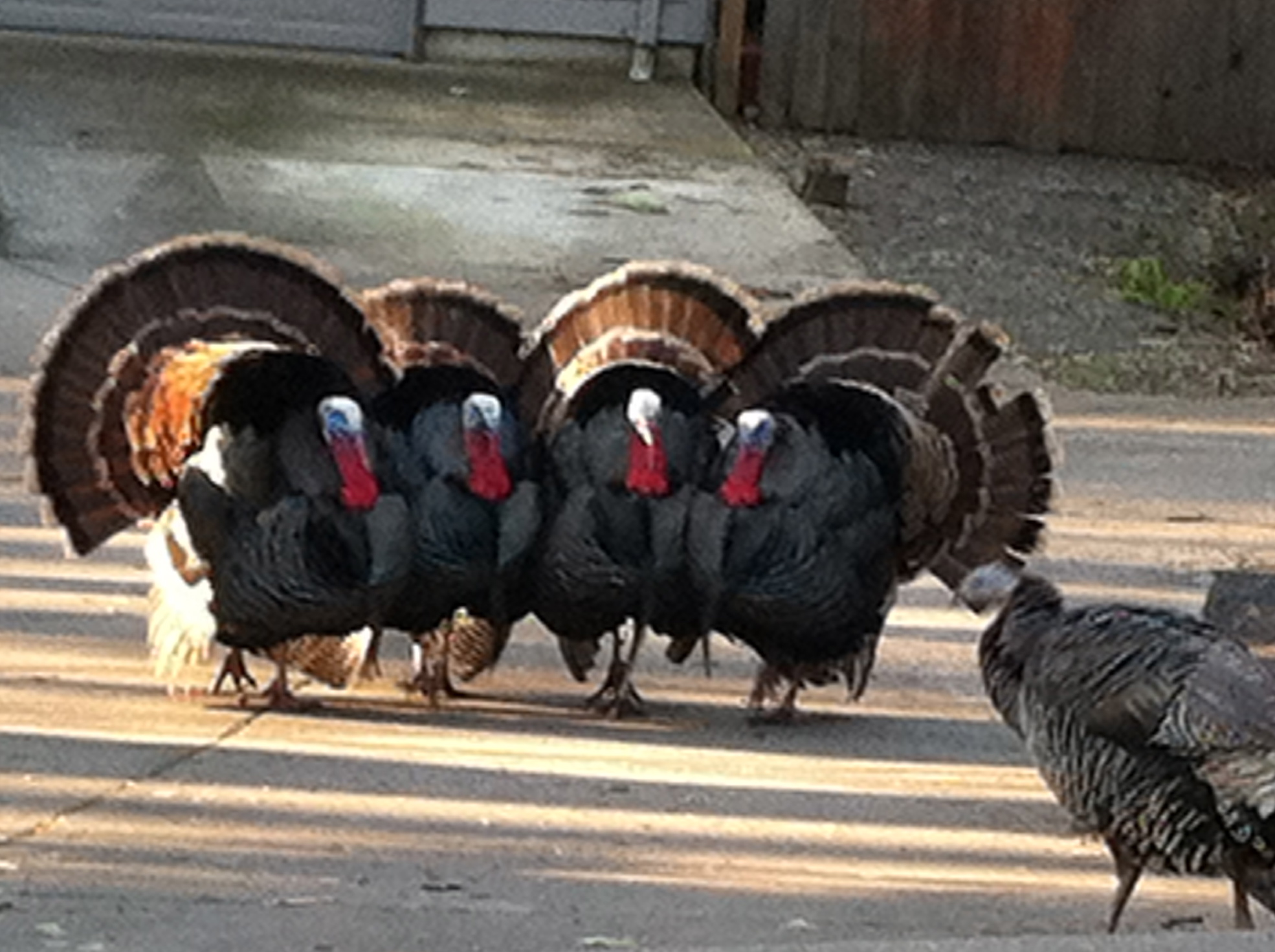 This quartet of Tom turkeys are strutting their stuff in full regalia to attract the lone female who happens to be strolling by. Sadly, it’s hard to tell them apart, except the one on the right has some torn tail issues.