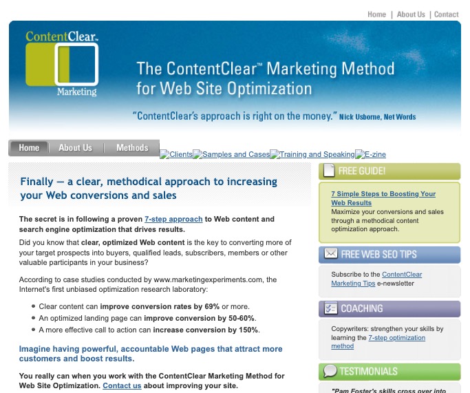 Here’s an image of my first site for ContentClear Marketing. That’s when I started to formulate my Site Content Audit method, the first to focus on CONTENT QUALITY for website visitors (vs. technical quality, which is also important). It’s also about the time I created my 5 C’s of Content That Works™.